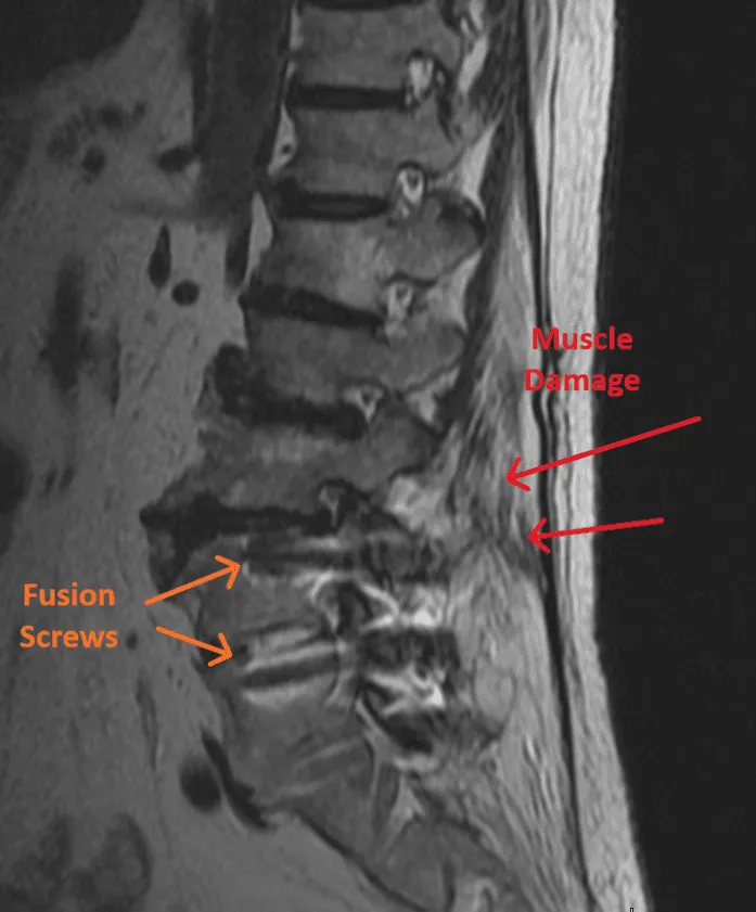 Persistent or worsened chronic pain following spinal fusion requiring lifelong management.